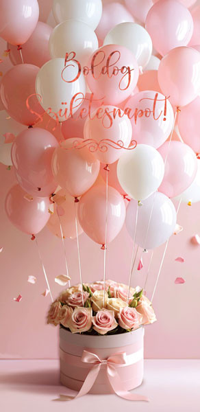 ÜDVÖZLŐLAP BORÍTÉKKAL SZÜLETÉSNAPRA, RÓZSASZÍN FEHÉR LUFIK