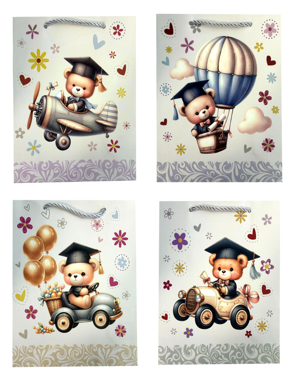 ZSINÓRFÜLES AJÁNDÉKTÁSKA BALLAGÓ MACI MINTÁVAL, 4 FÉLE, NAGY